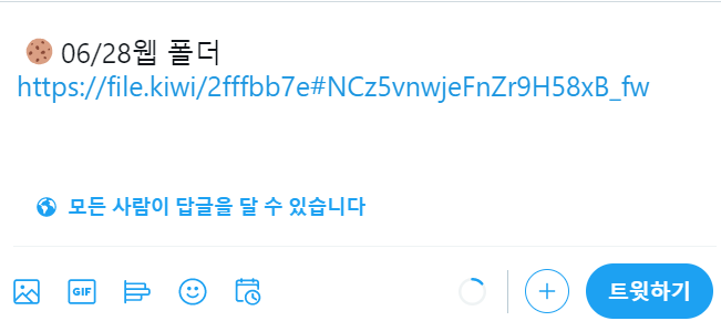 마지막 단계에서 트위터 버튼을 누르면 웹폴더 링크가 트위터의 글쓰기 페이지로 전달됩니다.